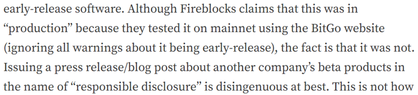 Según BitGo, Fireblocks afirmó erróneamente que la versión preliminar era una versión de producción. Según los informes, hicieron esto después de usar el monedero en la red principal, en contra del consejo de BitGo.