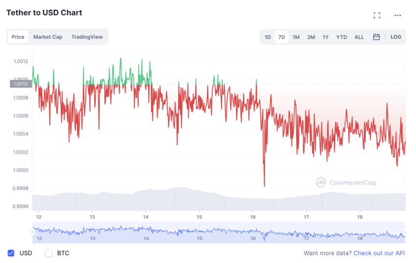 Entre el 14 y el 18 de abril, la stablecoin USDT osciló entre $1,0012 y $1,0003. Fuente: CoinMarketCap