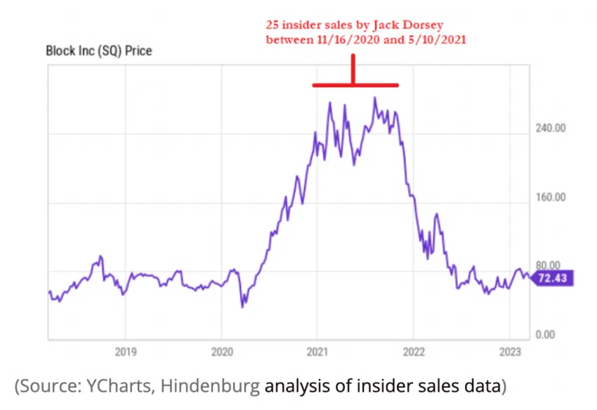 Además, Hindenburg afirma que los expertos, incluido el director ejecutivo Jack Dorsey, vendieron acciones por valor de más de mil millones de dólares. El informe dice: “En general, Block Insiders aumentó el tamaño y el trading de sus ventas en el momento justo, ya que las acciones aumentaron a principios de 2021″.