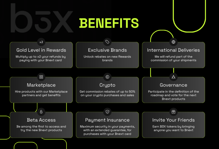 • Pagos con tarjeta asegurados: Los usuarios que realicen sus pagos con su tarjeta Bnext estarán asegurados con un volumen específico de tokens B3X.