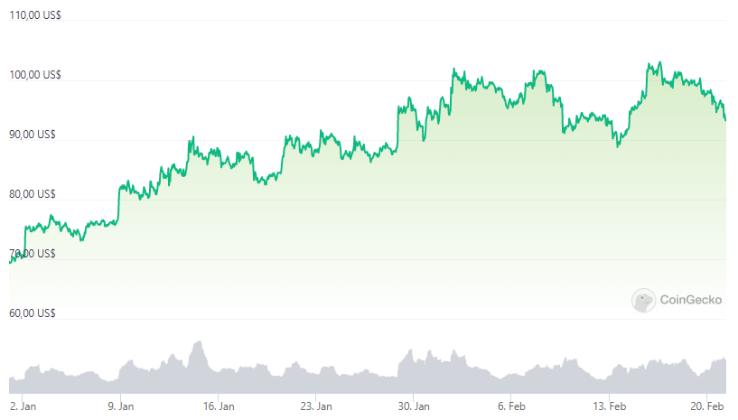 LTC inició el año cotizando en 69.62 dólares y, al momento de la publicación, el precio de Litecoin se ubica en 93.27 dólares, según los datos de CoinGecko.