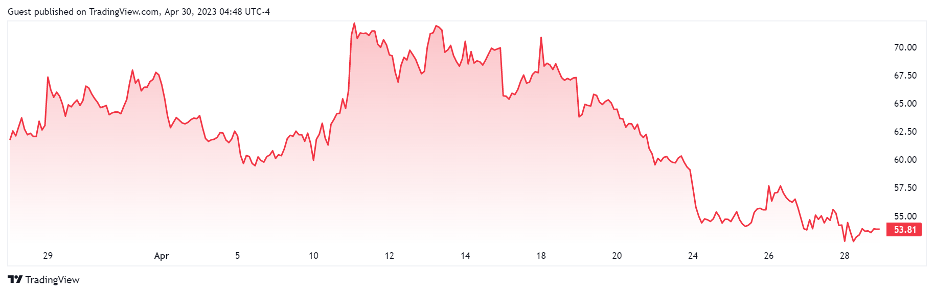 Durante el período, las acciones del exchange alcanzaron un máximo de 72 dólares el 11 de abril antes de caer drásticamente a 53.79 dólares al cierre de esta edición.