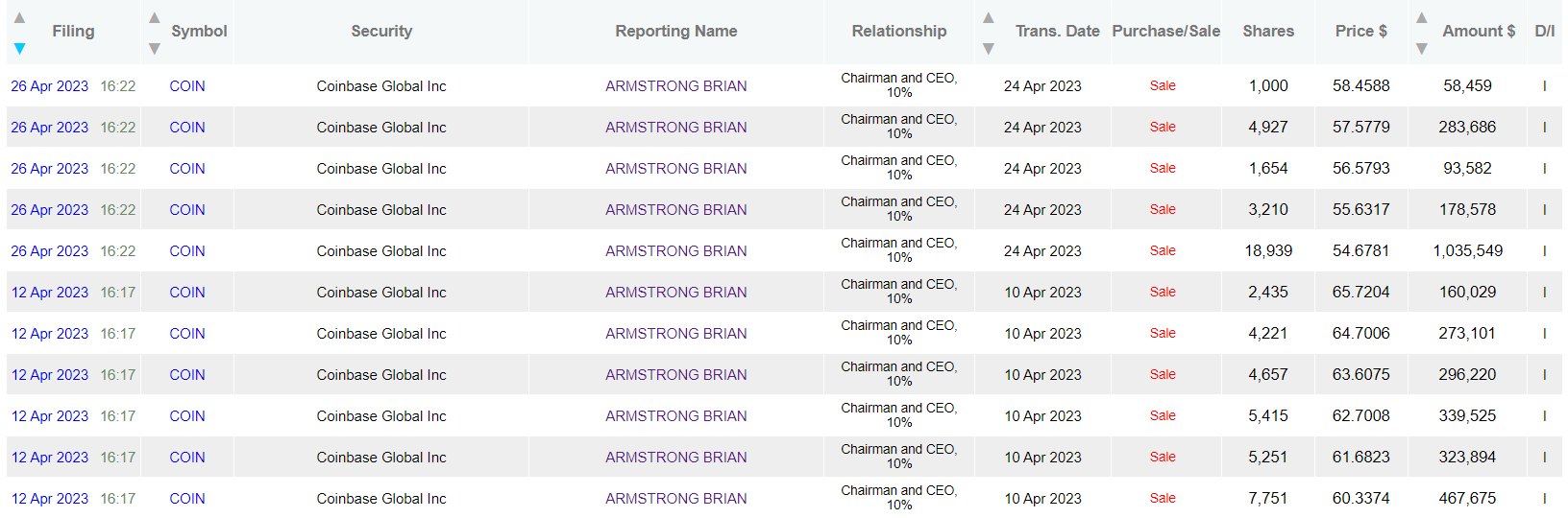 Un desglose de las ventas mostró que Armstrong vendió 29.730 acciones por 1,86 millones de dólares en seis transacciones el 10 de abril antes de realizar cinco transacciones más el 24 de abril. Previamente, el CEO de Coinbase vendió 89,196 COIN por 5,8 millones de dólares en marzo.