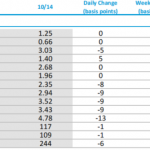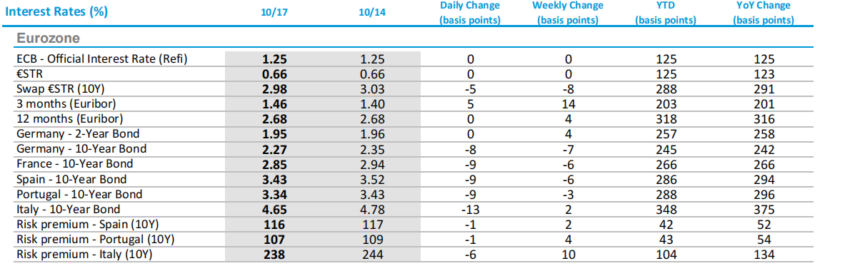 En su reporte de los mercados financieros para el mes de Octubre, CaixaBank mencionó que en la primera sesión de la semana, la confianza de los inversores mejoró debido a que las tasas de interés soberanas cayeron en ambos lados del Atlántico y en medio de publicaciones de ganancias corporativas mejores de lo esperado en Estados Unidos. Los índices de renta variable aumentaron sustancialmente en todos los ámbitos.