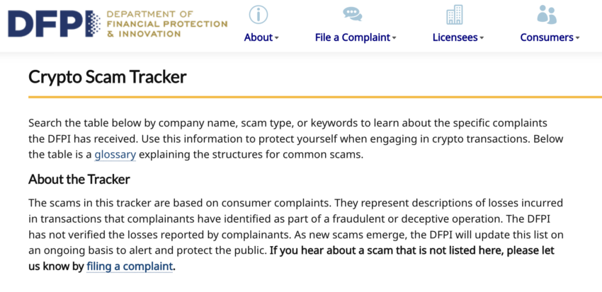 “Las estafas en este rastreador se basan en las quejas de los consumidores. Representan descripciones de pérdidas incurridas en transacciones que los denunciantes han identificado como parte de una operación fraudulenta o engañosa. La DFPI no ha verificado las pérdidas reportadas por los denunciantes. A medida que surjan nuevas estafas, el DFPI actualizará esta lista de manera continua para alertar y proteger al público.”