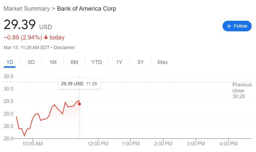 Gráfica de precio de acciones de Bank of America en un día. Fuente: Google Finance