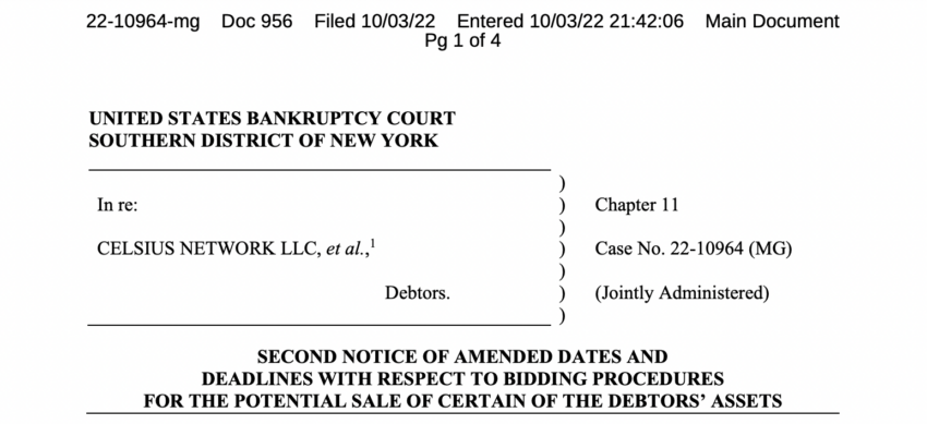 La empresa de préstamo de criptomonedas en quiebra Celsius Network fijó fechas para la subasta de activos, según un documento presentado ante el Tribunal de Bancarrotas de Estados Unidos para el Distrito Sur de Nueva York el 3 de octubre. La subasta se llevará a cabo el 20 de octubre a las 10 a.m.