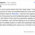 Roberts anunció esto en su página de LinkedIn. Fue la primera contratación de finanzas para el marketplace de NFT y fue responsable del crecimiento del equipo de finanzas.