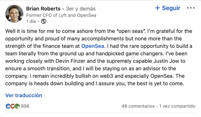 El ex director financiero de Lyft dijo que es “increíblemente optimista en Web 3.0 y especialmente en OpenSea. La empresa está construyendo con la cabeza baja y les aseguro que lo mejor está por venir”.