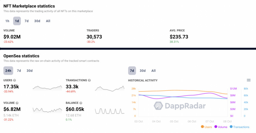 El volumen de trading de OpenSea ha caído a nuevos mínimos después de comenzar el año con fuerza. Según datos de DappRadar, el marketplace de NFT registró un volumen de transacciones de 341,43 millones de dólares en los últimos 30 días.