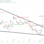 Aún así, el hecho de no superar este importante muro de oferta podría desencadenar un aumento en la toma de ganancias que conduce a una caída hacia el límite inferior de la cuña en alrededor de 30 dólares.