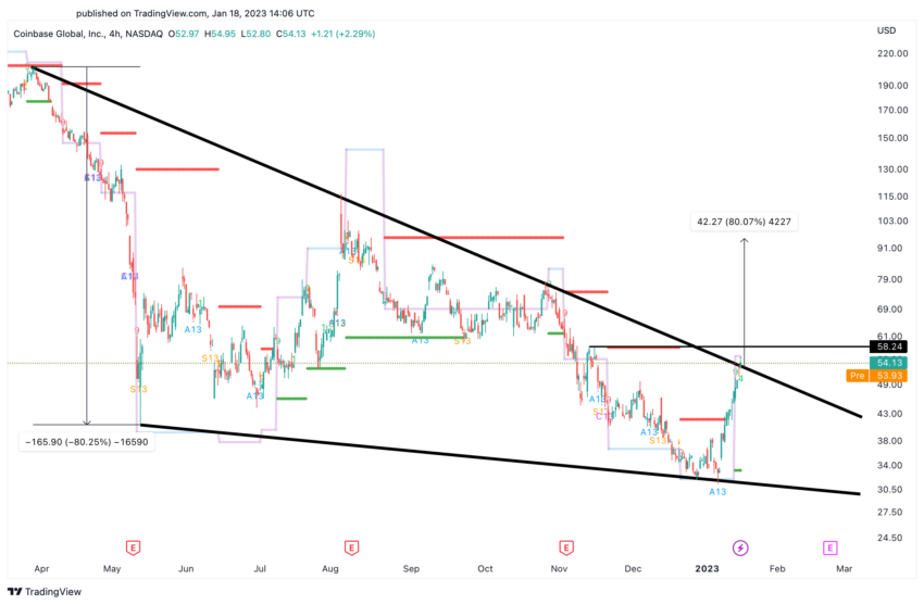 Desde una perspectiva técnica, COIN parece estar saliendo de una cuña descendente en su gráfico de cuatro horas. Un cierre sostenido por encima del nivel de resistencia de 58 dólares podría desencadenar un movimiento alcista del 80% hacia 90 dólares.
