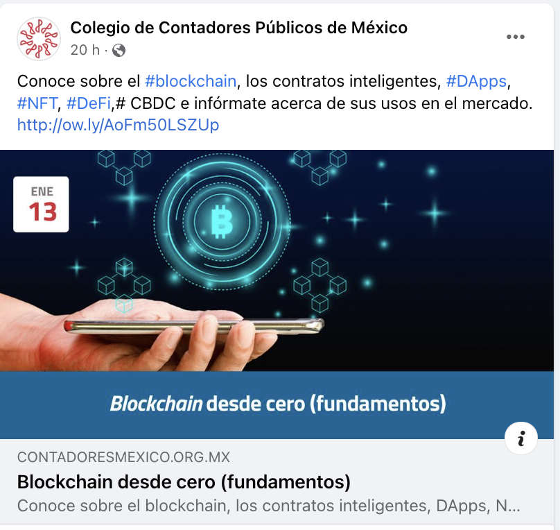 El Colecio de Contadores Públicos de México (IMCP) impartirá el curso “Blockchain desde cero (fundamentos)”, en el que abordará los fundamentos de la tecnología, así como los smart contracts, DApps, tokens no fungibles (NFT), finanzas descentralizadas (DeFi) y monedas digitales emitidas por bancos centrales (CBDC).