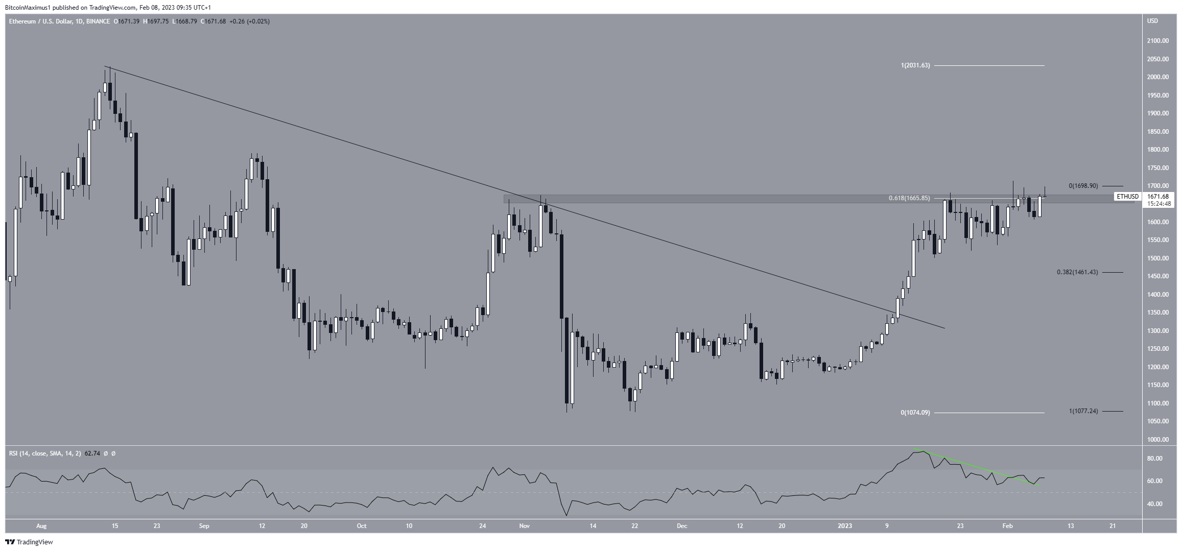 El precio de Ethereum ha aumentado rápidamente desde que salió de una línea de resistencia descendente el 11 de enero. El aumento llevó a un máximo de 1,712 dólares el 2 de febrero. Sin embargo, el precio del token ETH creó una vela de estrella fugaz (icono rojo), validando los 1,664 dólares nivel como resistencia. Esta es un área de resistencia crucial ya que es el nivel de resistencia de retroceso de Fib de 0.618 y un área de resistencia horizontal.
