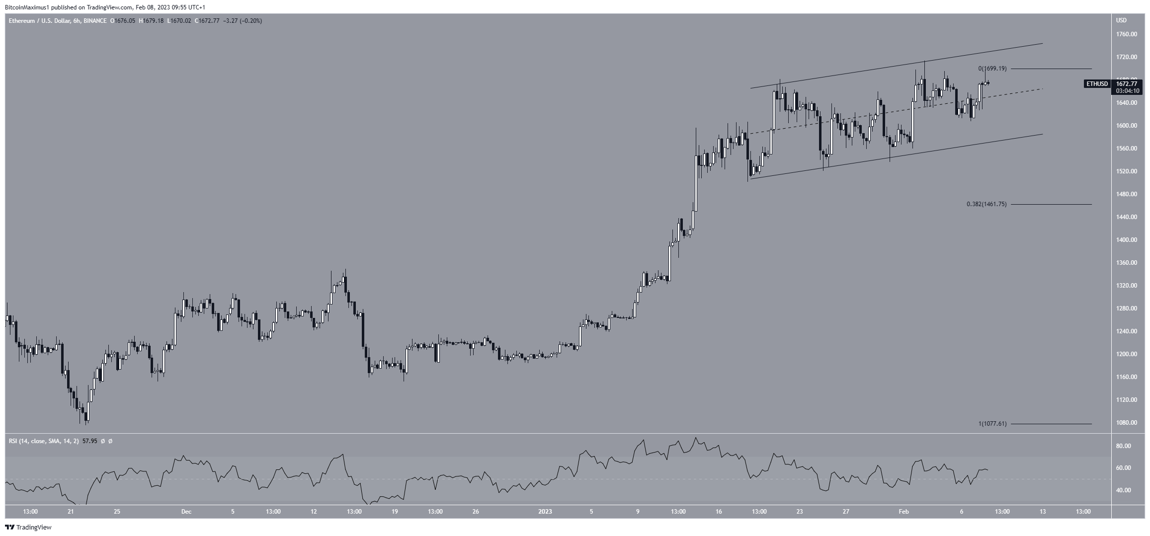 El análisis técnico del marco de tiempo de seis horas muestra que el precio de ETH se ha negociado dentro de un canal paralelo ascendente desde el 18 de enero. Aunque dichos canales se consideran patrones bajistas, el precio se negocia en su parte superior, lo que permite la posibilidad de una ruptura