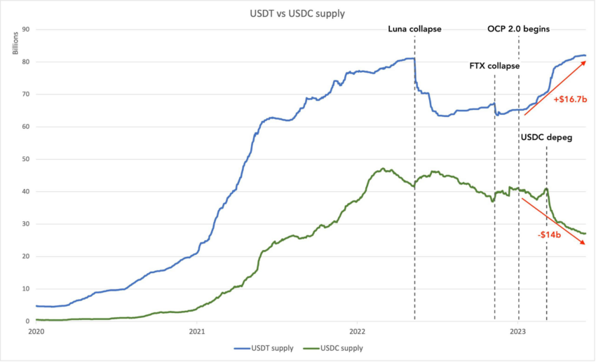 La cuota de mercado de USDT de Tether ha aumentado a expensas de la cuota de USDC de Circle durante el año pasado.