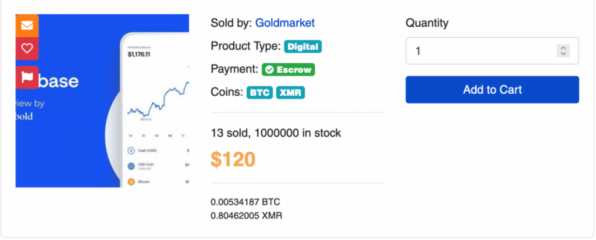 - Cuenta verificada de Coinbase hackeada – 250 dólares.