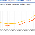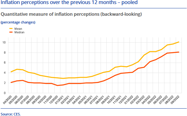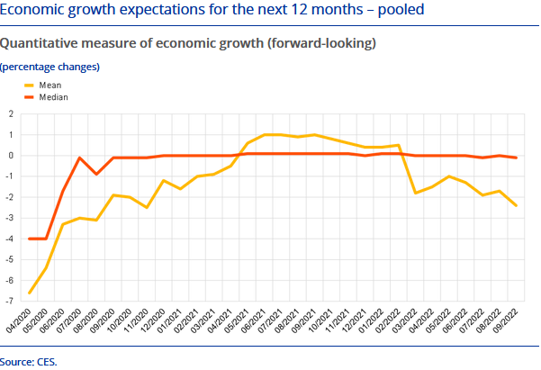 Los consumidores consultados pronostican que la inflación se situará en el 5% dentro de doce meses y en el 2,8% dentro de tres años, algo que contrasta fuertemente con el objetivo inflacionario del 2% defendido por el BCE. También creen que la zona euro se contraerá un 1,3 % en 12 meses y un aumento del desempleo hasta el 11,5%.