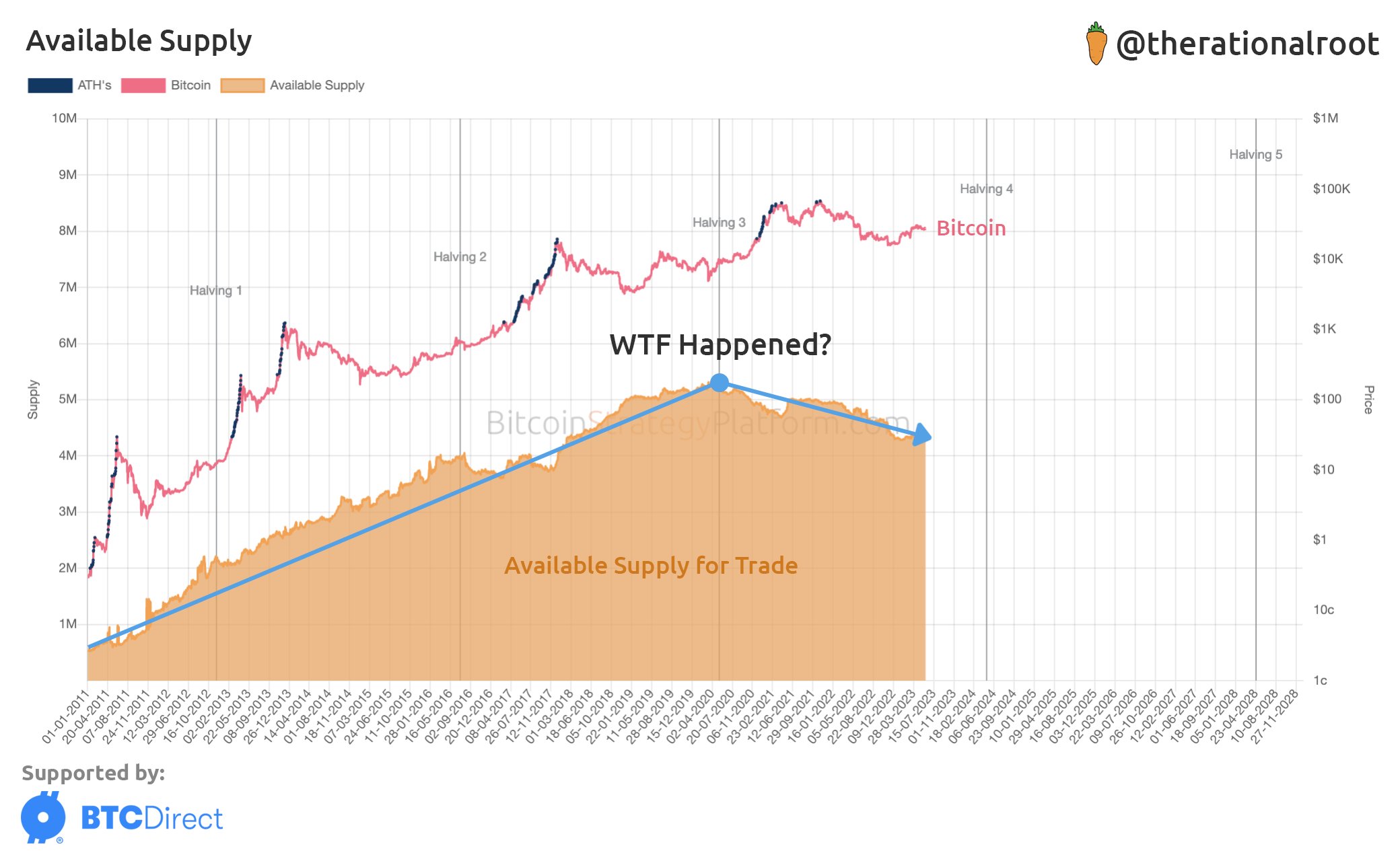 El 25 de junio, el analista on-chain “@therationalroot” informó que el suministro disponible para el trading ha disminuido desde el tercer halving experimentado en mayo de 2020.