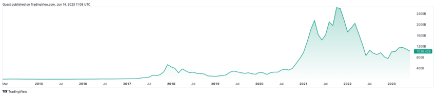 La industria ha pasado de ~$100 billones en 2019 a ~$1 trillón en 2023. Ese ritmo de crecimiento haría que las criptomonedas sean una activos de $10 trillones en solo cuatro años, y un activo de $100 trillones en una década (equivalente al valor conjunto de los mercados americanos de acciones y bonos)