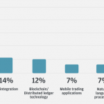 AI fue citada cuatro veces más que blockchain y la tecnología de registro distribuido (DLT), que quedó en tercer lugar con el 12% de los votos. La integración de API ocupó el segundo lugar con 14% y las aplicaciones comerciales móviles cayeron al 7% desde el primer lugar el año pasado con 29%.