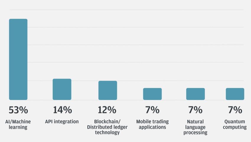 JPMorgan descubrió que 53% de los inversores institucionales encuestados creen que la inteligencia artificial (IA) y el aprendizaje automático serán las tecnologías más influyentes que darán forma al futuro del comercio durante los próximos tres años, un aumento significativo respecto del 25% del año anterior.