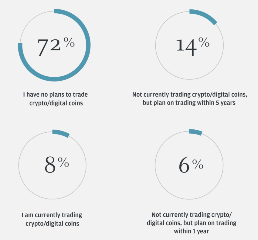 El informe de edición de comercio electrónico también analizó el futuro de las criptomonedas. Alrededor del 72% de los inversores institucionales dicen que no tienen planes de invertir en criptomonedas o monedas digitales. A pesar de esto, el informe señaló que los participantes anticipan que el 64% de sus actividades estarán en esta industria para 2024.