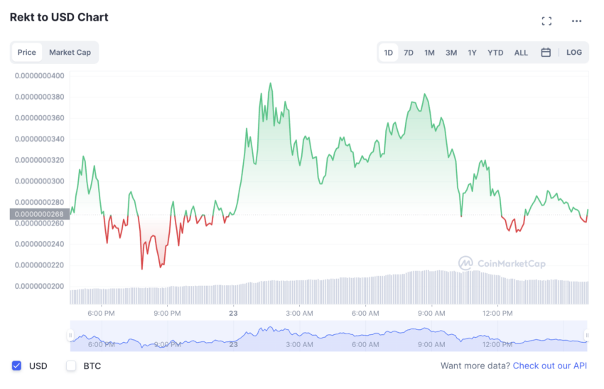Tras la triple cotización, el valor de REKT se disparó a un nuevo máximo histórico de 0,00000003935 dólares, según los datos de CoinMarketCap.