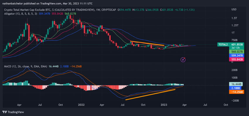 Una divergencia de precios MACD alcista oculta está presente en el marco de tiempo semanal. La divergencia alcista sugiere que la capitalización total del mercado cripto, excluyendo Bitcoin, podría aumentar a 710 mil millones de dólares, lo que representa un aumento del 17,94%.