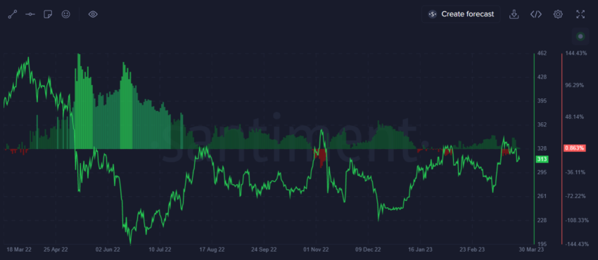 Si el precio de Binance Coin supera el máximo comercial de marzo de 347 dólares, entonces la divergencia de direcciones activas diarias ajustadas por precio podría revertirse, marcando una ganancia potencial del 33.75% en abril de 2023.