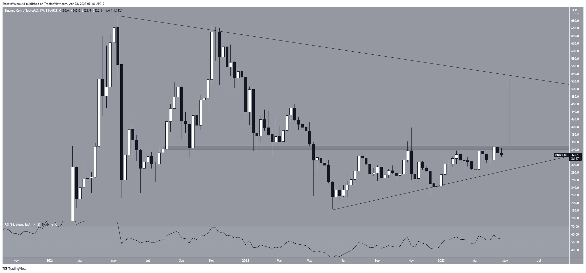 Además de la línea, el precio de BNB también enfrenta resistencia desde el área de resistencia horizontal de 345 dólares. Combinados, crean un triángulo ascendente, que se considera un patrón alcista.