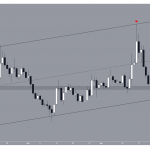 La mecha superior larga creada en la línea de resistencia del canal se considera una señal bajista, ya que significa que los compradores no pudieron mantener el precio. Más bien, los vendedores tomaron el control y lo empujaron hacia abajo.