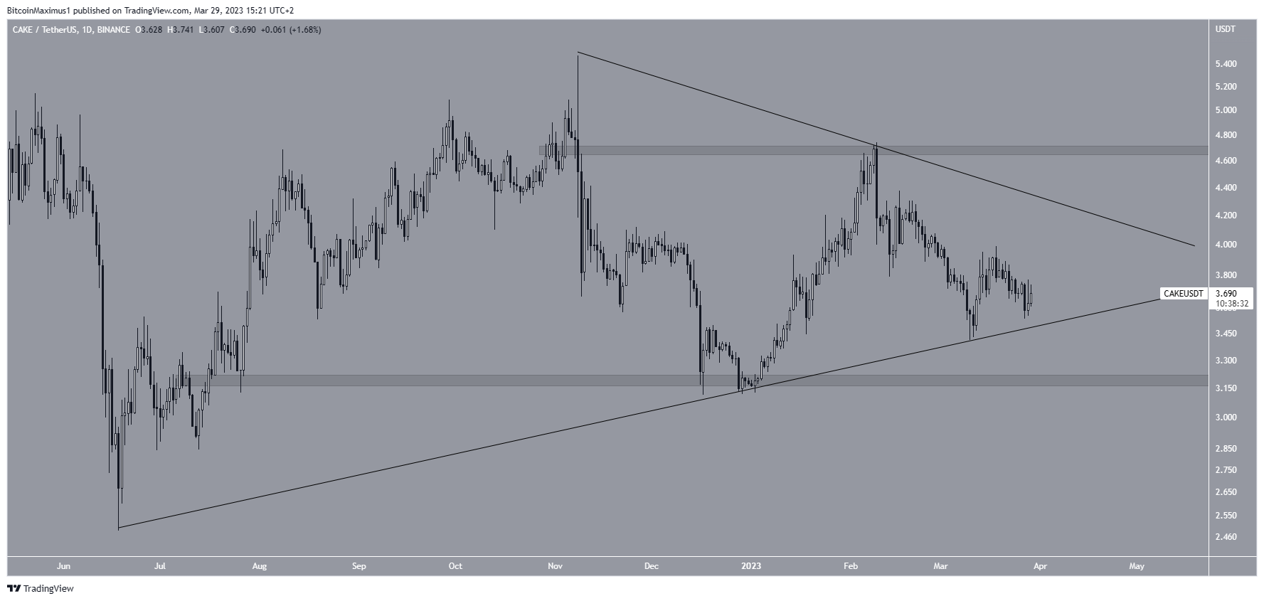 El precio de CAKE se ha negociado dentro de un triángulo simétrico a largo plazo desde junio de 2022. Actualmente, el precio está muy cerca de la línea de soporte del triángulo.