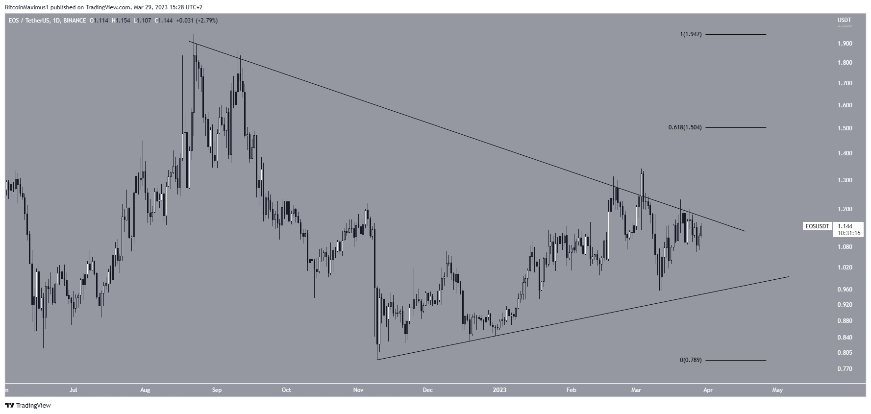 El precio de EOS todavía sigue una línea de resistencia descendente desde agosto de 2022. Si rompe, podría pasar rápidamente a la siguiente resistencia de 1.50 dólares.
