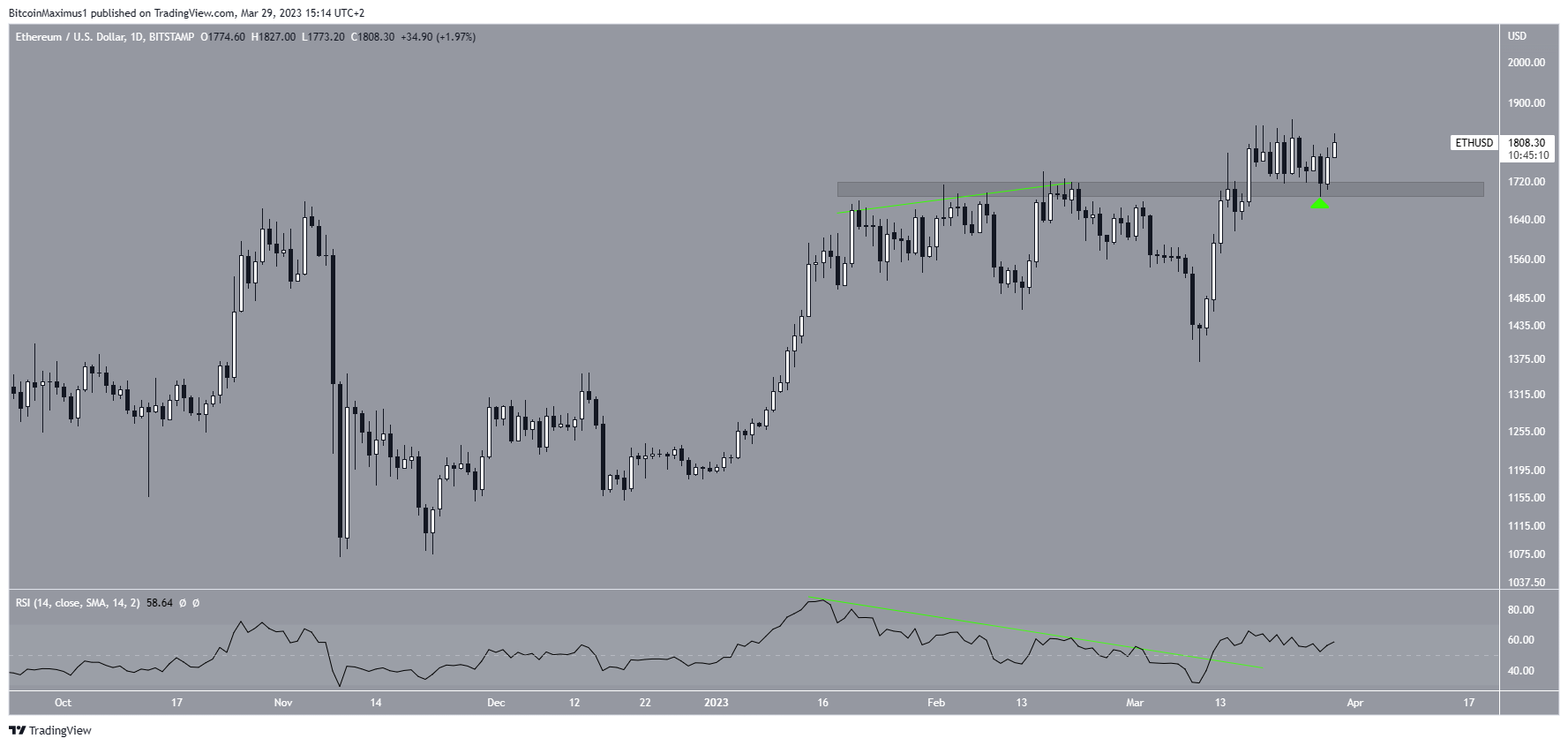 El movimiento de precios de Ethereum parece decididamente alcista. El precio ha aumentado rápidamente desde el 10 de marzo y recuperó el área de soporte de 1,700 dólares el 17 de marzo, validándolo con éxito como soporte 10 días después (icono verde).