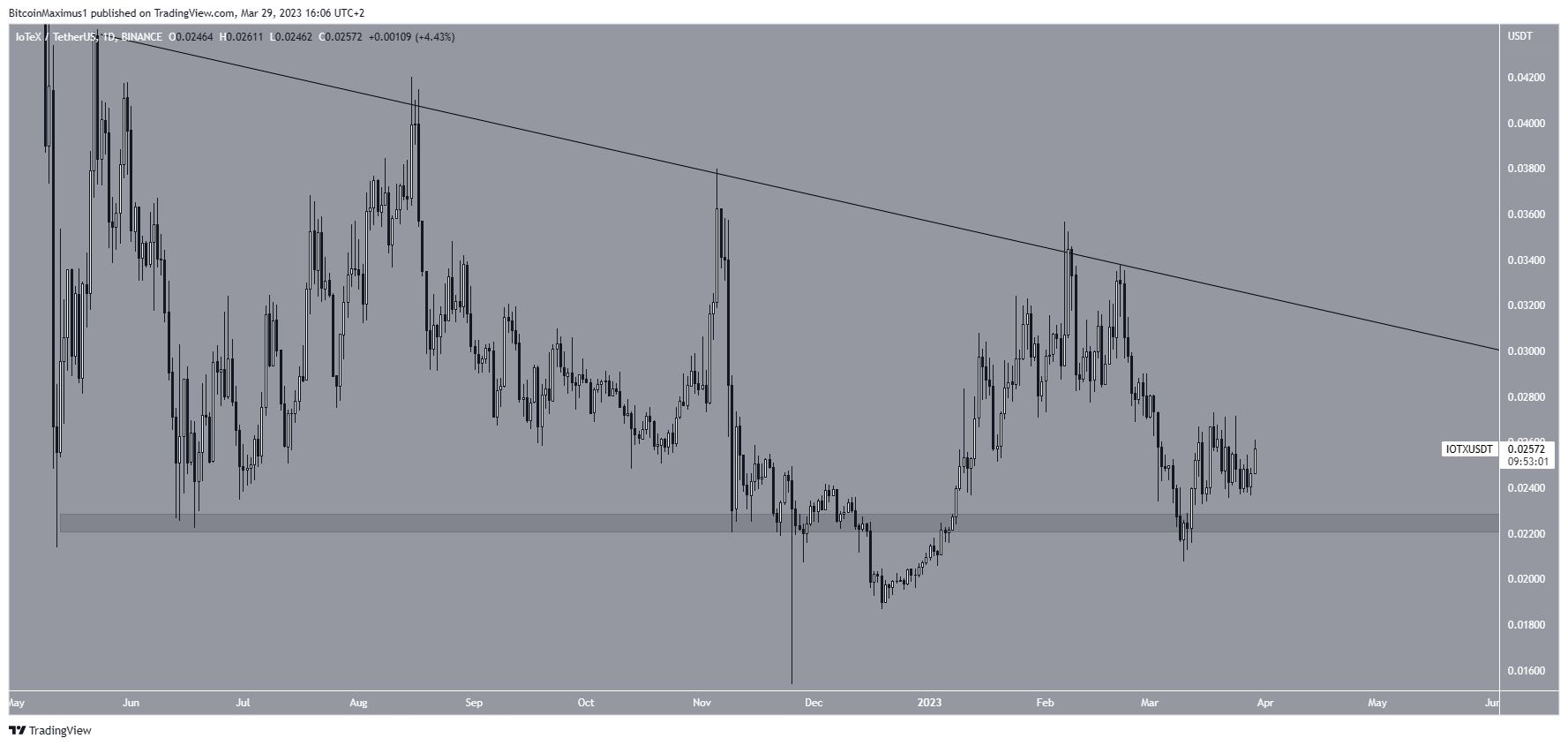 El precio de IOTX rebotó en el área de soporte horizontal de 0.022 dólares el 10 de marzo. Ha aumentado desde entonces. Si el movimiento alcista continúa, el precio podría aumentar hasta la línea de resistencia descendente a largo plazo en 0.030 dólares.