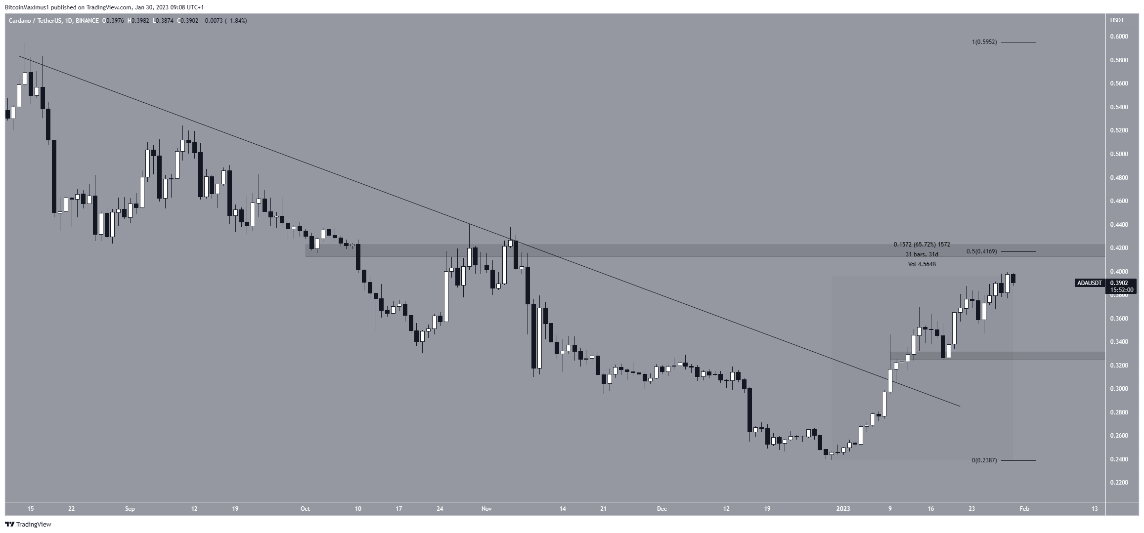 El precio de Cardano ha aumentado un 66% desde principios de año. Salió de una línea de resistencia descendente a largo plazo el 9 de enero. El precio ahora está muy cerca del área de resistencia de 0.42 dólares. Si experimenta ruptura o es rechazado podría determinar la dirección de la tendencia.
