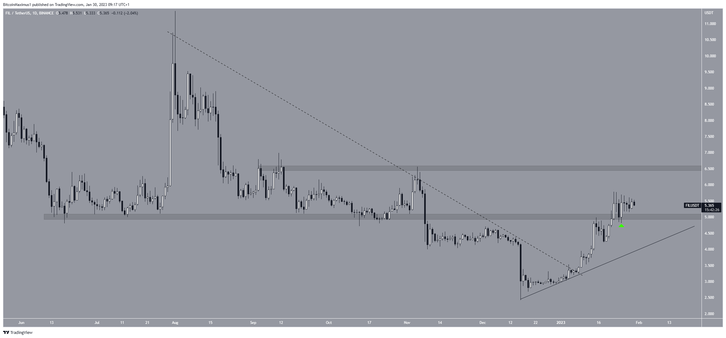 Al igual que el precio de Cardano, el precio de FIL también salió de una línea de resistencia descendente el 8 de enero. Posteriormente, recuperó el área de resistencia de 5 dólares y la validó como soporte el 25 de enero (icono verde). La tendencia sigue siendo alcista siempre que la altcoin no cierre por debajo de la resistencia de 5 dólares. En ese caso, la próxima resistencia estaría en 6.50 dólares.