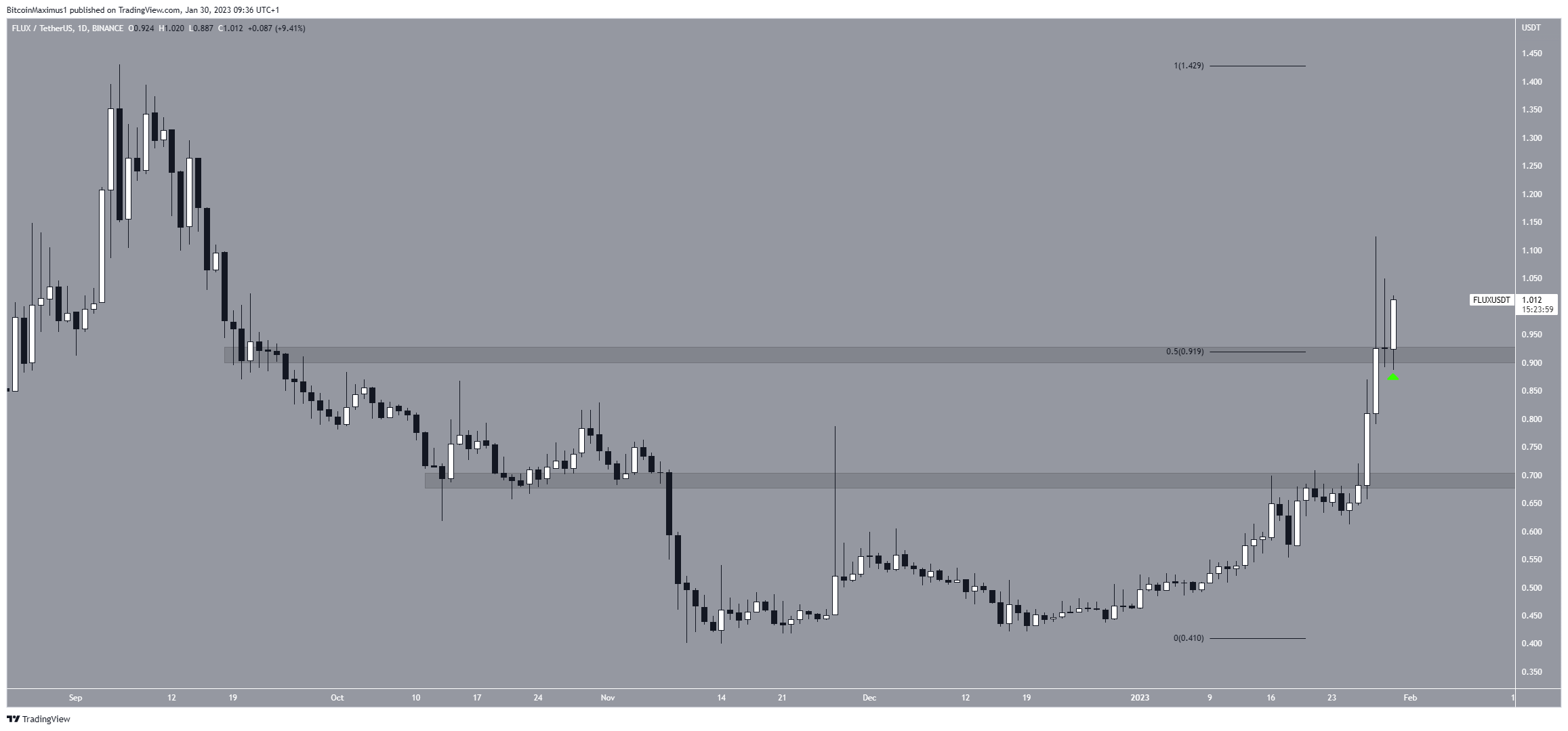 El precio de FLUX se movió por encima del área de resistencia de 0.92 dólares y la validó como soporte el 30 de enero. Si el aumento continúa, la próxima resistencia estaría en 1.43 dólares. Por otro lado, un cierre por debajo del área de 0.92 dólares podría llevar a una caída a 0.69 dólares.