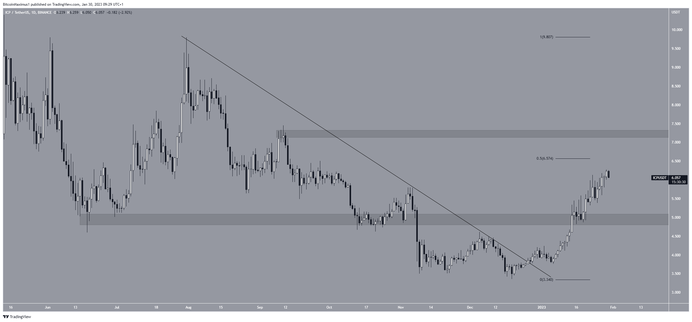 El precio del ICP rompió una línea de resistencia descendente el 28 de diciembre. Hasta ahora, ha alcanzado un máximo de 6.28 dólares. Sin embargo, el precio aún está por debajo del nivel de resistencia de retroceso de 0.5 Fib a 6.58 dólares.