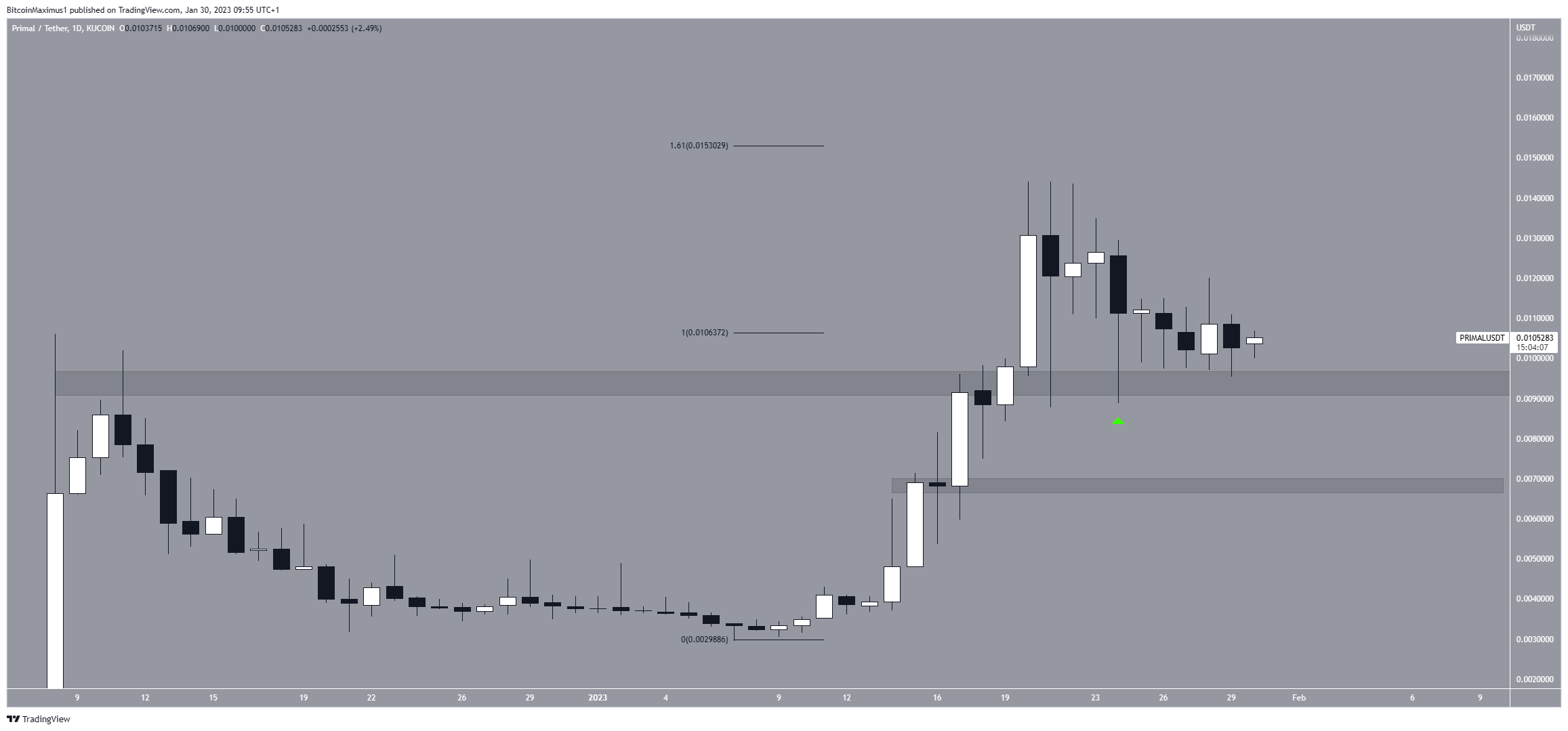 El precio de PRIMAL alcanzó un máximo histórico de 0.014 dólares el 20 de enero. Posteriormente, regresó y validó el área horizontal de 0.009 dólares como soporte cinco días después. Esto creó una mecha inferior larga (icono verde).