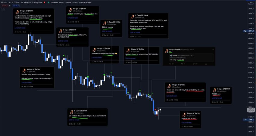 Por el contrario, cuando el analista hizo apuestas bajistas sobre el precio de BTC el 22 de enero, el precio de Bitcoin se apreció un 25% en la semana siguiente después de las “predicciones de Il Capo de una mecha por debajo de $30K”.