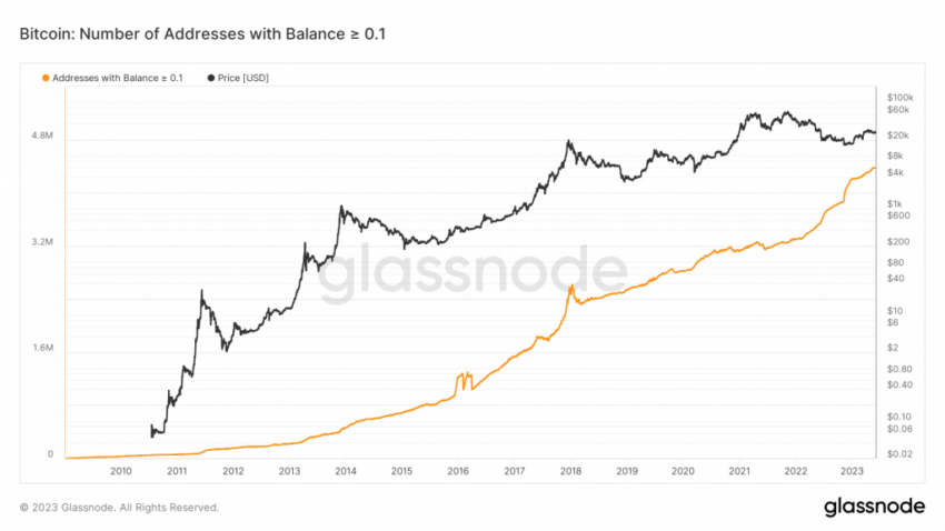 Por ejemplo, la cantidad de direcciones con un saldo de más de 0.1 BTC ha superado los 4,3 millones, según datos de Glassnode.