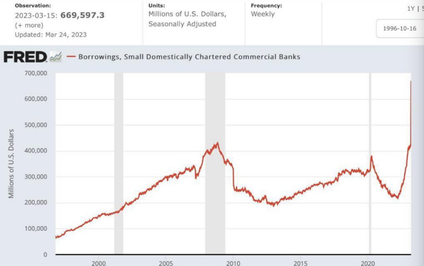 CNN informó que los préstamos de los pequeños bancos estadounidenses alcanzaron la tasa más alta desde el cambio de siglo. Según el informe, los bancos tomaron prestados 669,600 millones de dólares esta semana. Pero los analistas creen que esto es solo un esfuerzo de los bancos para prepararse para cualquier corrida bancaria y no necesariamente indica un problema actual.