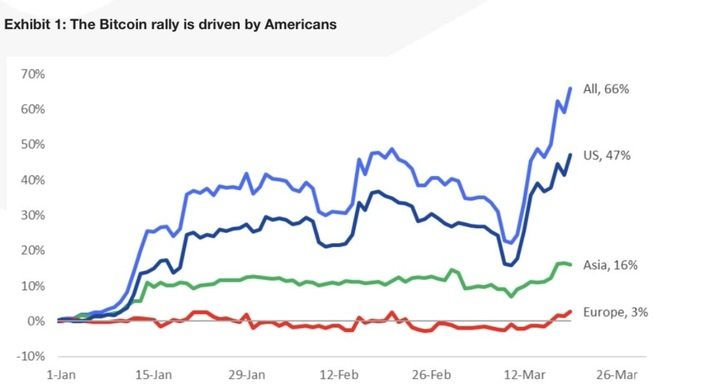 Una mirada al reciente repunte de Bitcoin mostró que los inversores estadounidenses habían jugado un papel importante en el aumento de los precios. Según el jefe de investigación y estrategia de Matrixport, Markus Thielin, “los estadounidenses están comprando Bitcoin con ambas manos”.