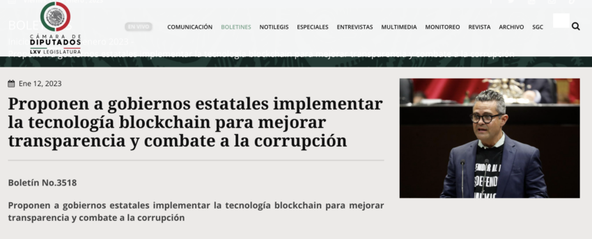 El diputado del partido Movimiento Ciudadano (MC) de México, Andrés Pintos Caballero, propuso ante la Cámara de Diputados la utilización de blockchain para el combate contra la corrupción y para mejorar la transparencia, ya que esas malas prácticas habrían costado 9,500 millones de pesos en 2021.
