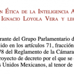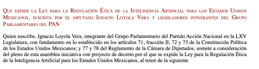 “Al amparo de las leyes mexicanas y, sin violación alguna, es que se presenta la siguiente propuesta por la cual se expide la Ley de Regulación Ética de la Inteligencia Artificial y la Robótica, en un marco normativo apegado a derecho y, con la urgente necesidad de comenzar a normar este nuevo reto al que se enfrenta el México contemporáneo”.