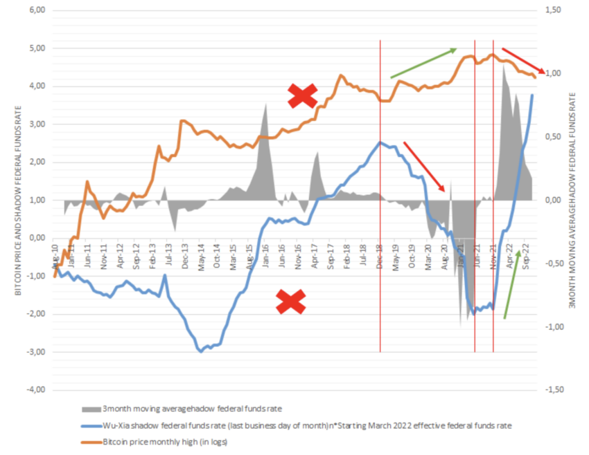 Los analistas cripto han notado que desde este ciclo, la política monetaria se ha vuelto relevante para Bitcoin. El pico de la tasa de fondos federales en la sombra el 18 de diciembre ha marcado más o menos el fondo del mercado bajista.