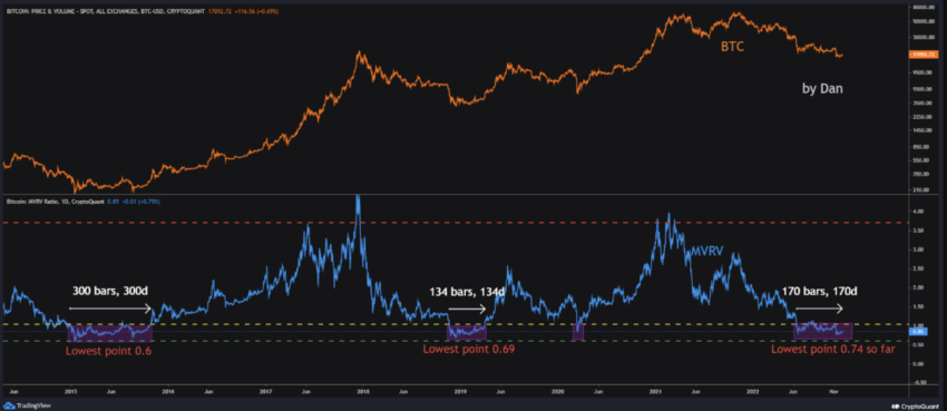 El valor de mercado de Bitcoin a valor realizado (MVRV), también presenta una visión interesante del fondo de BTC. Un análisis reciente de CryptoQuant mostró que, en la parte inferior de los mercados bajistas anteriores, la duración del indicador MVRV indicaba si el precio de Bitcoin estaba sobrevaluado o subvaluado.