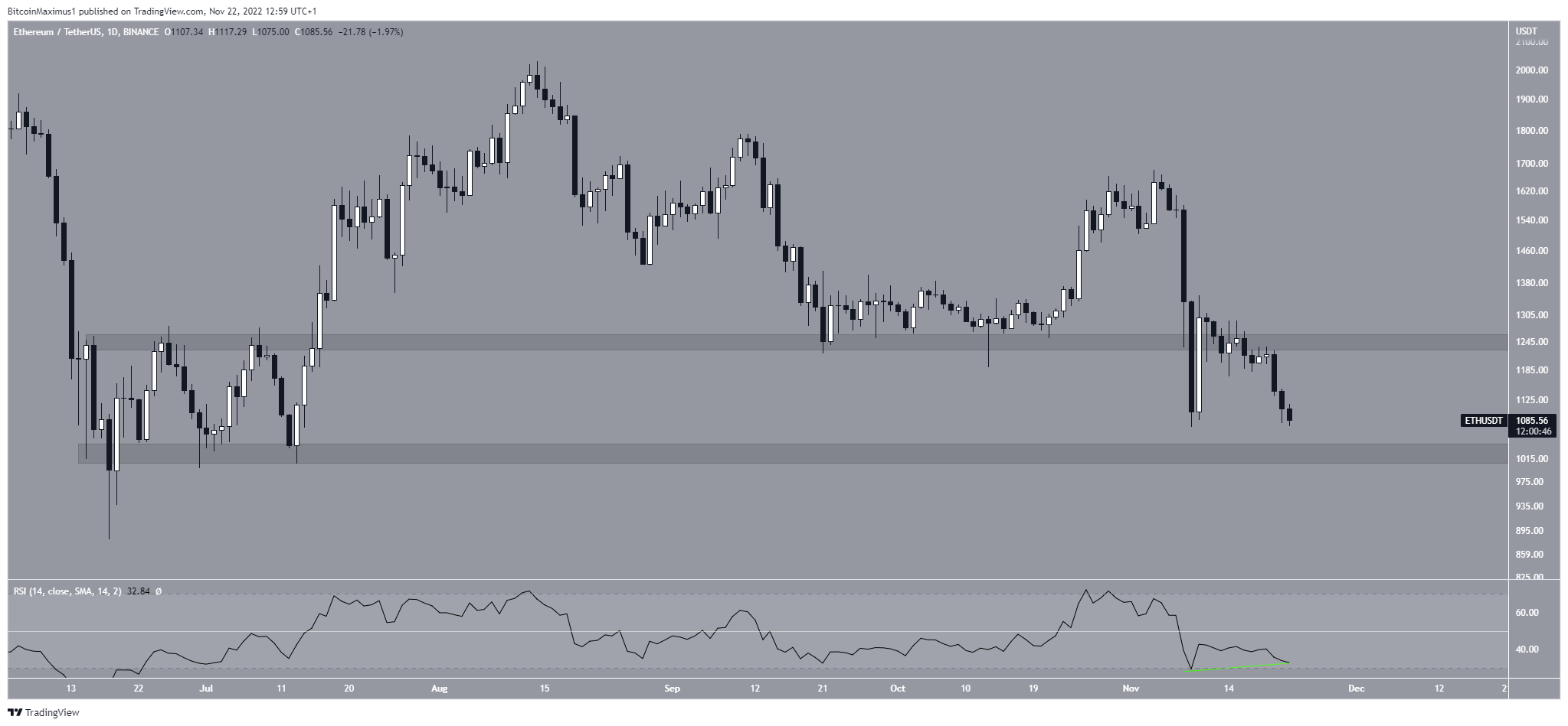 De manera similar a BTC, una recuperación del área de 1,250 dólares confirmaría el fondo. Además, un rebote del precio actual validaría una divergencia alcista (línea verde) en el RSI diario.